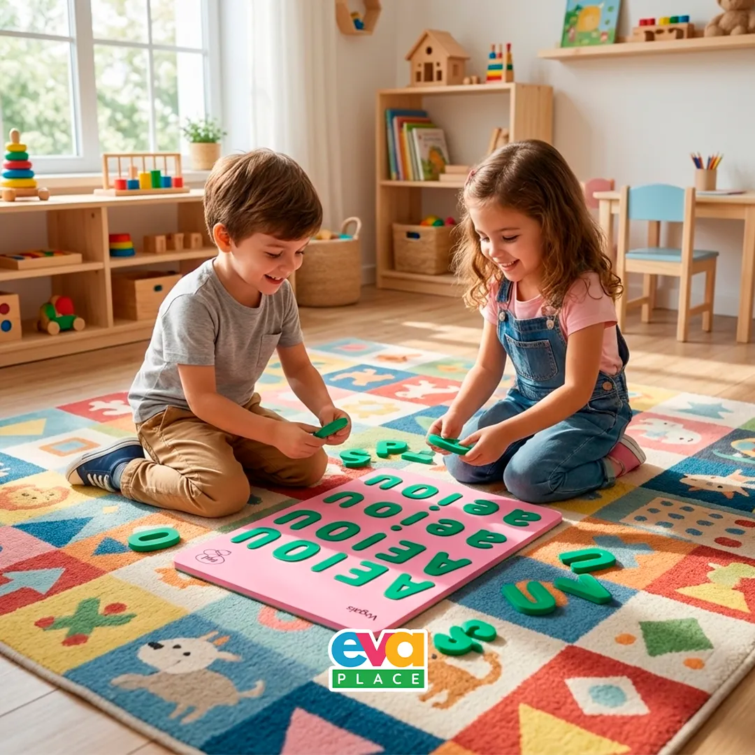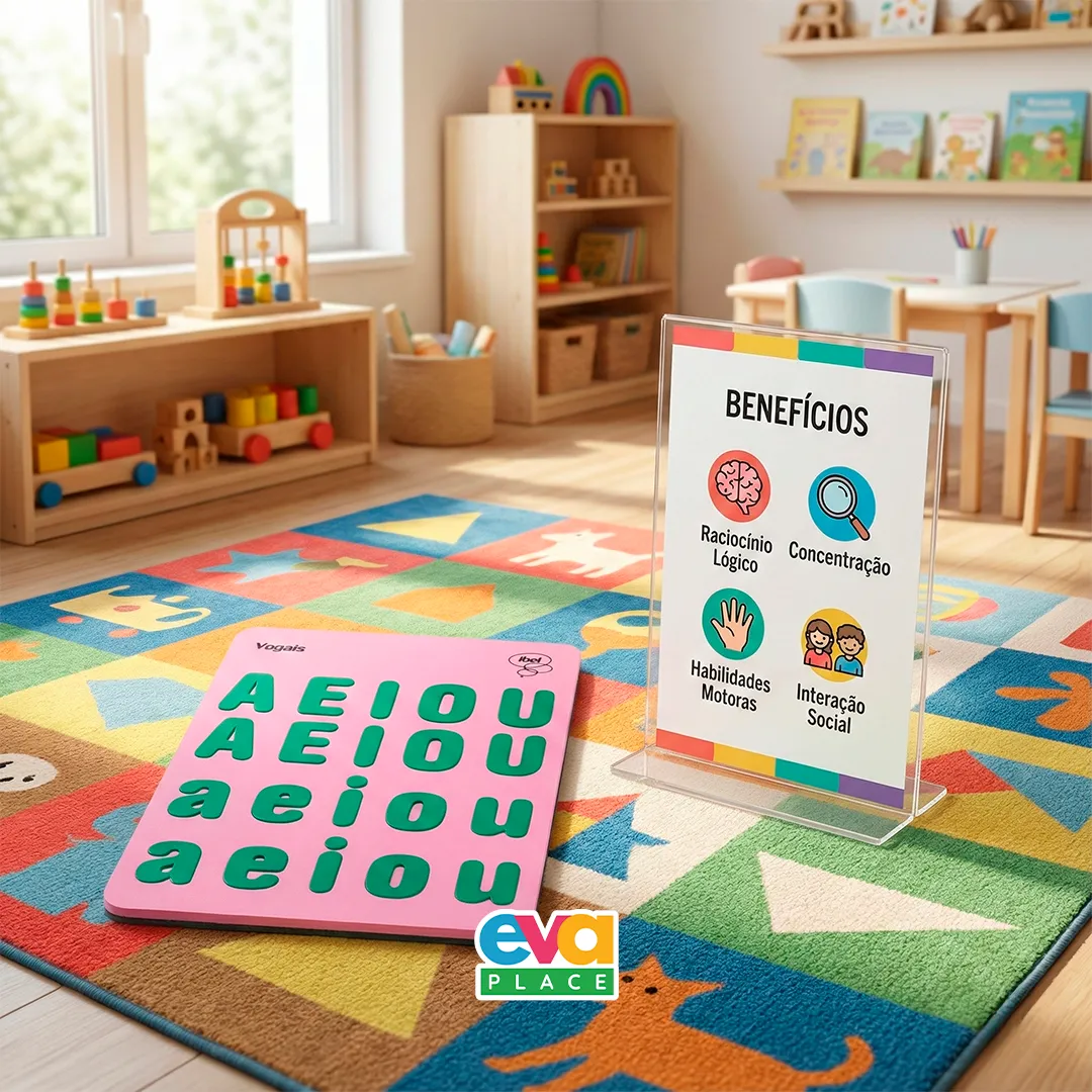 O Jogo das Vogais em EVA é um material educativo desenvolvido para apoiar o processo de alfabetização infantil, auxiliando no reconhecimento, identificação e memorização das vogais de forma visual e prática.