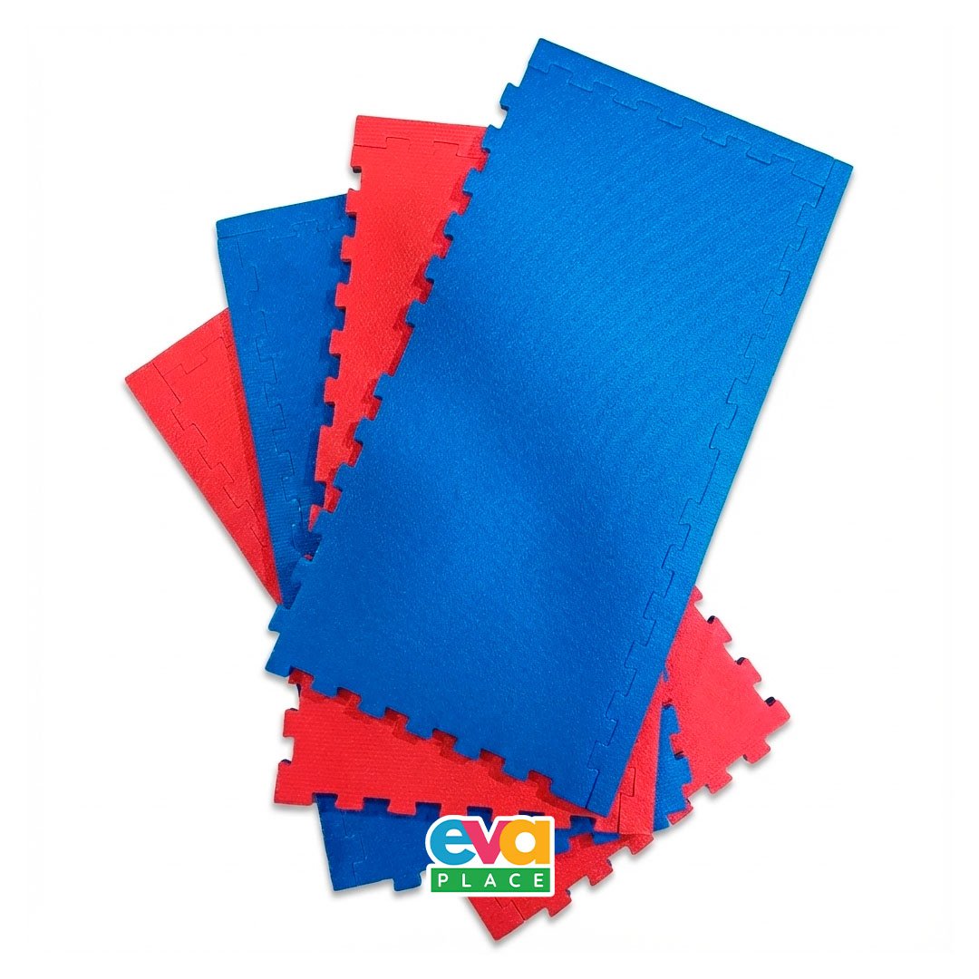 Composto por 8 placas de EVA dupla face (azul/vermelho), o kit oferece excelente absorção de impacto, ajudando a reduzir o risco de lesões e proporcionando mais estabilidade durante os exercícios.