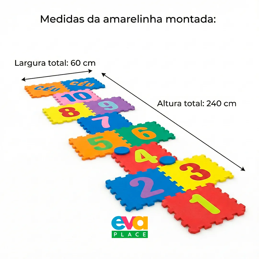 Quando montada conforme o formato padrão da amarelinha, a estrutura ocupa aproximadamente 240 cm de comprimento por 60 cm de largura, conforme demonstrado nas imagens. Essa configuração é ideal para uso em residências, quartos infantis, brinquedotecas, escolas, creches e espaços educacionais.