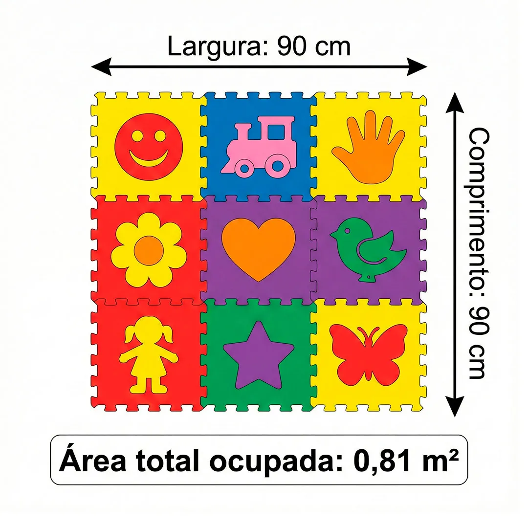Quando montado no formato padrão, o tapete forma uma área total aproximada de 90 cm x 90 cm, ocupando 0,81 m², conforme demonstrado nas imagens. Essa dimensão é adequada para uso em residências, quartos infantis, brinquedotecas, escolas, creches e espaços educacionais.