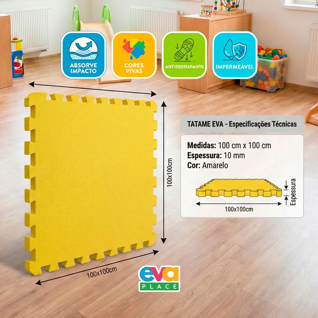 O Tatames de EVA 100x100cm com 10mm de espessura é perfeito para criar áreas seguras e confortáveis. Fabricado em material de EVA de alta densidade, é resistente, antiderrapante e fácil de limpar. Ideal para: